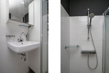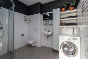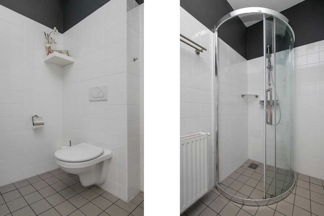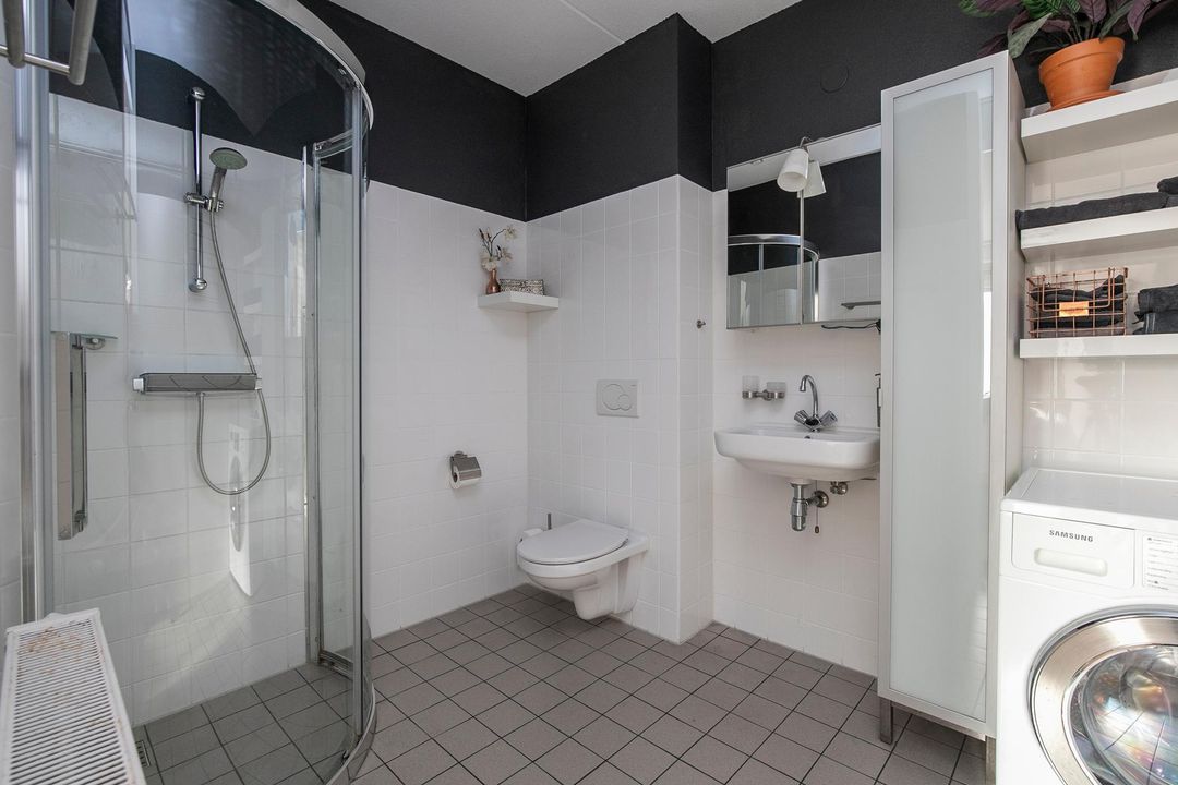 De badkamer is ruim van opzet en biedt plaatst voor alle gemakken. Zo heeft u een hangend toilet waarvan de spoelbak netjes is weggewerkt in de wand, een wastafel, een ruime inloopdouche en u vindt hier de aansluiting voor uw wasmachine en droger. De ventilatie is eenvoudig te regelen middels het mechanische ventilatiesysteem. De wanden zijn voor ¾ betegeld met een witte wandtegel in combinatie met een antraciet geschilderde strook aan de bovenkant. Op de vloer licht een lichtgrijze vloertegel.