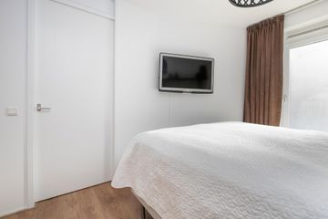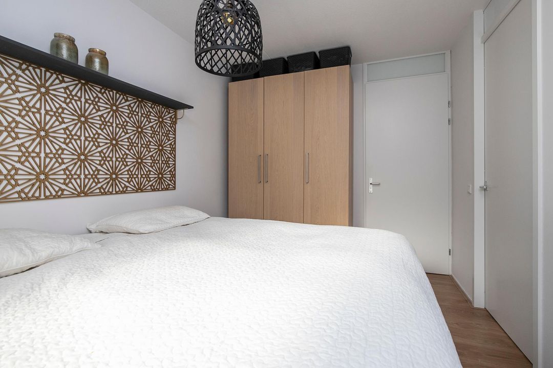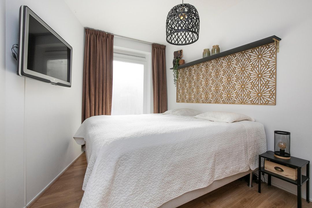 In de slaapkamer heeft u voldoende plek voor een 2 persoons bed en een ruime garderobekast. Ook deze kamer wordt prachtig belicht door het royale draai-kiepraam.