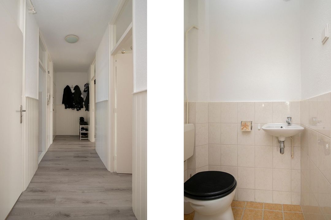Bij binnenkomst treft u de ontvangsthal met toegang tot de woonkamer, de 2 slaapkamers, de keuken en de separate toiletruimte. Vanuit hier is de nette lichtgrijze laminaatvloer doorgelegd naar de woonkamer en de 2 slaapkamers. Zowel het plafond als de wanden zijn afgewerkt met strak wit schilderwerk. Daarnaast zijn de wanden voorzien van crèmekleurige lambrisering. De toiletruimte is half betegeld met een zalmoranje vloertegel en een crèmekleurige wandtegel. Daarnaast is er een staand toilet en een fonteintje aanwezig.