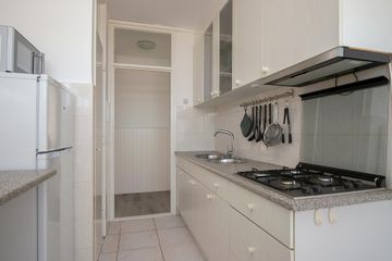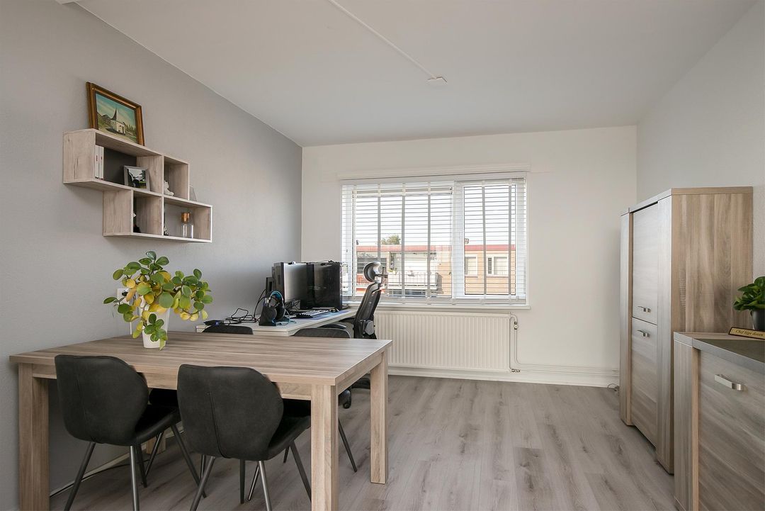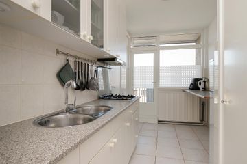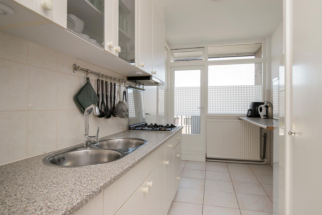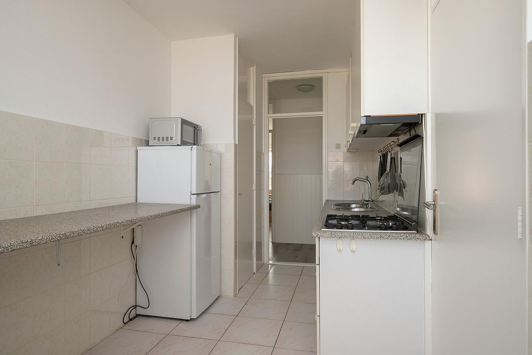 De keuken in praktisch ingericht doordat er is gekozen voor een rechte opstelling met een extra werkblad parallel aan het keukenblok. Vanuit de keuken heeft u toegang tot de badkamer, ruime bergkast en het balkon (2m2 op het noorden). De keuken is half betegeld met lichte tegels aan de wanden en op de vloer. Het keukenblok heeft een kunststof werkblad waarin de 1,5 spoelbak en de 4-pits gaskookplaat netjes in zijn verwerkt. De opbergkasten zijn afgewerkt met lichte panelen. In het kastje boven het fornuis is de afzuigkap netjes afgewerkt.