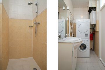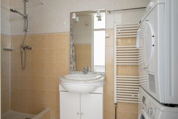 De badkamer is toegankelijk vanuit de keuken en is volledig betegeld. Waar de vloer een crèmekleurige tegel heeft, is er aan de wanden gekozen voor zalmoranje tegels in combinatie met lichte tegels. De ruimte heeft een inloopdouche met handdouche, een wastafel met meubel en een designradiator. Daarnaast treft u in deze ruimte de aansluiting voor uw wasmachine en droger én de cv-ketel (Remeha 2008).