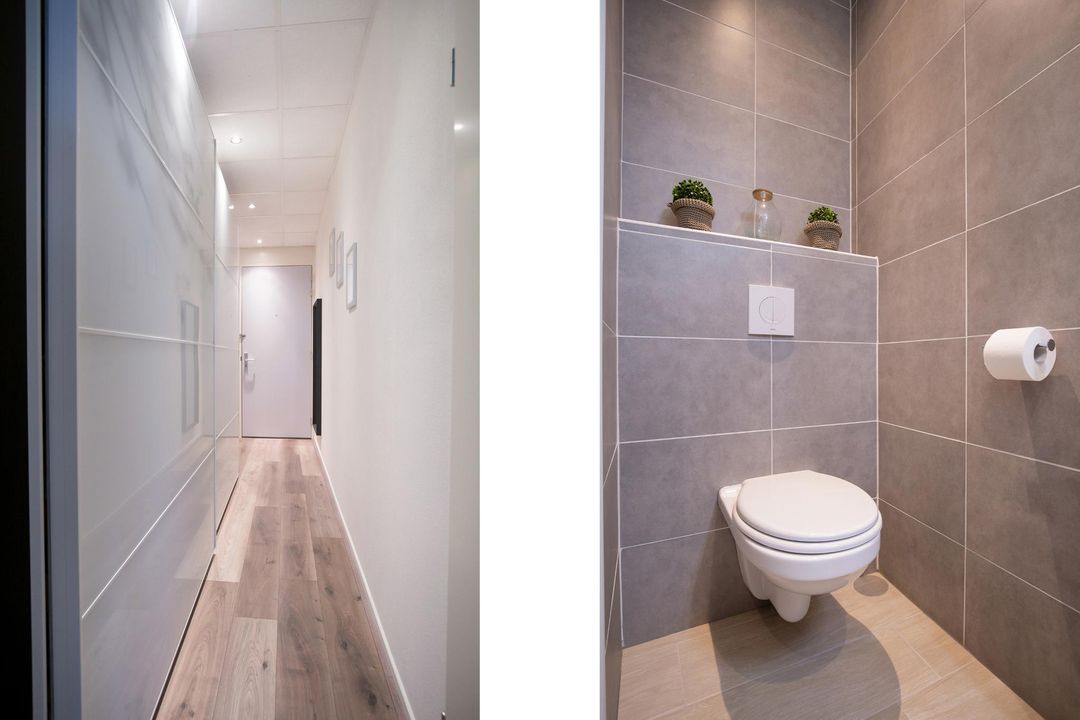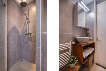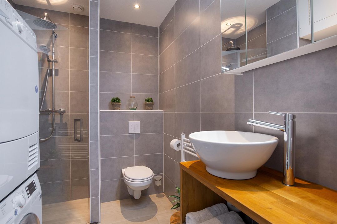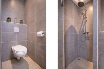 De badkamer is gerenoveerd in 2019 en is hierdoor in zeer goede conditie. Naast de praktische indeling heeft de badkamer ook nog eens een warme, moderne uitstraling! Er is gekozen voor een houtlook vloertegel in combinatie met een lichtgrijze wandtegel. Het plafond heeft verschillende inbouwspots en is afgewerkt met strak wit stucwerk. Daarnaast is er een inloopdouche aanwezig met hand- en regendouche, een was tafel met badkamermeubel en een hangend toilet waarvan de spoelbak netjes is weggewerkt in de wand. Ook vindt u hier de cv-installatie en de aansluiting voor uw wasmachine en droger.