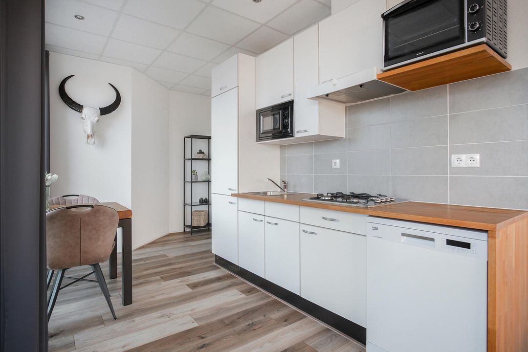 De keuken heeft een rechte opstelling. De opbergasten hebben witte panelen en zij voorzien van verschillende inbouwapparatuur zoals: een koelkast, een vriezer en een magnetron. Het houten werkblad heeft een rvs-spoelbak en een 4 pits gasfornuis met daarboven een afzuigkap. Ook is er een vrijstaande vaatwasser aanwezig die netjes is weggewerkt in het verlengstuk van het werkblad. De achterwand is betegeld met moderne lichtgrijze wandtegels.