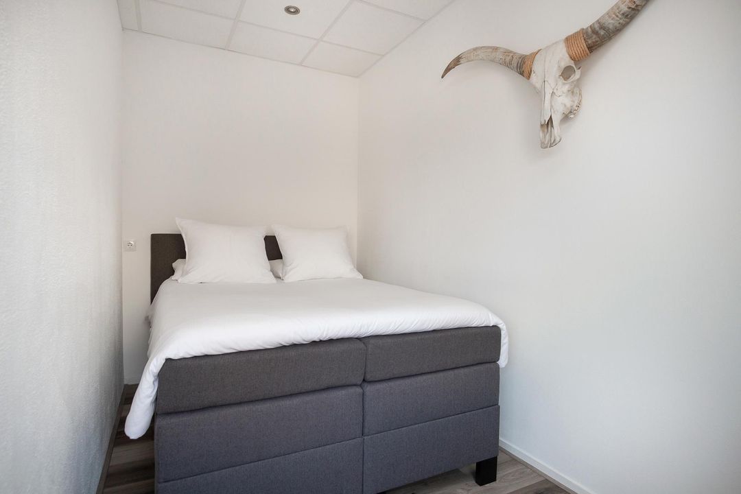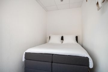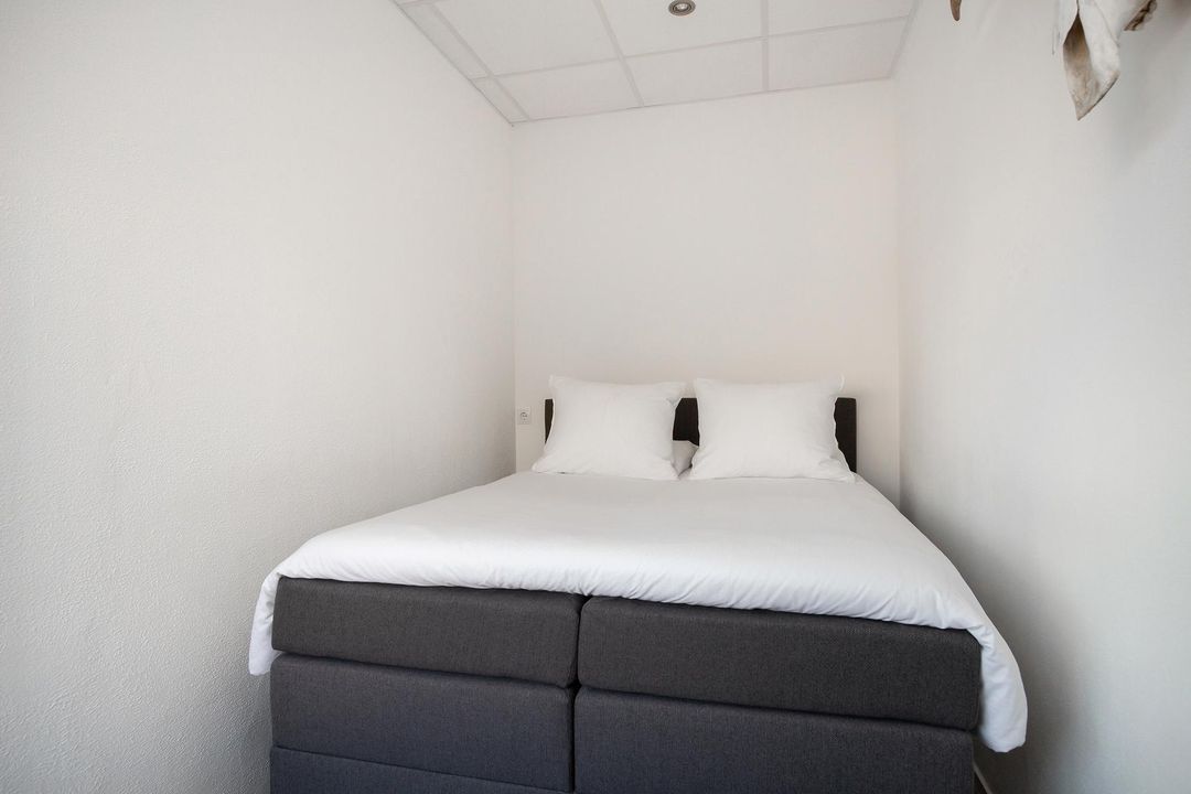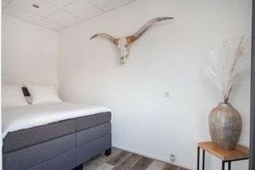 De woonkamer wordt prachtig belicht door de vele grote raampartijen. De ramen hebben kunststof kozijnen en er zijn 3 grote draaikiep ramen aanwezig. Daarnaast hebben de raampartijen aan de lage zijde een elektrisch te bedienden zonnescherm. Ook in de woonkamer is de strakke witte afwerking terug te vinden op de wanden en is het plafond voorzien van verschillende inbouwspots. Verlengd aan de keuken, is er een wand geplaatst met een vrije doorloop. Zo is uw slaapgedeelte fijn afgescheiden van de woonkamer.