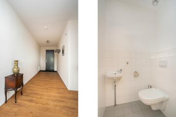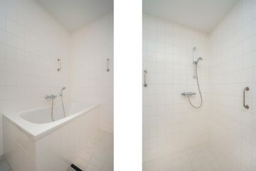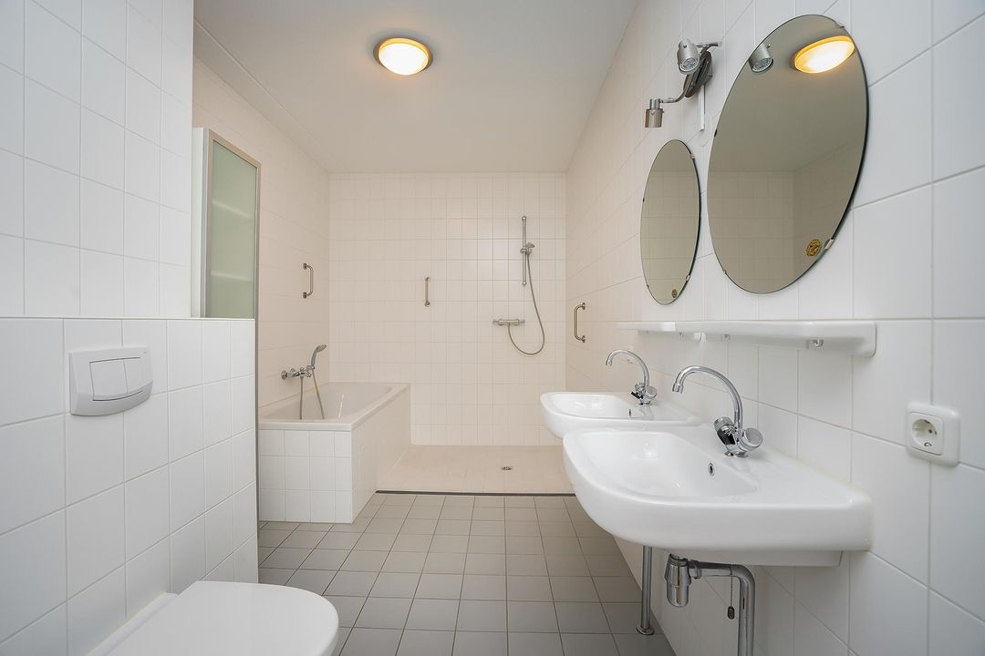 Ook de badkamer is ruim van opzet en van alle gemakken voorzien. De badkamer is volledig betegeld met een combinatie van lichtgrijze en witte tegels op de vloer en aan de wanden is er gekozen voor een keurige witte wandtegel. De badkamer heeft een ligbad met handdouche, een douche, 2 wastafels en een toilet. U kunt de ruimte eenvoudig ventileren middels het mechanische ventilatiesysteem.
