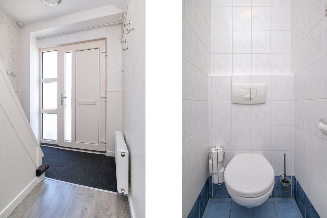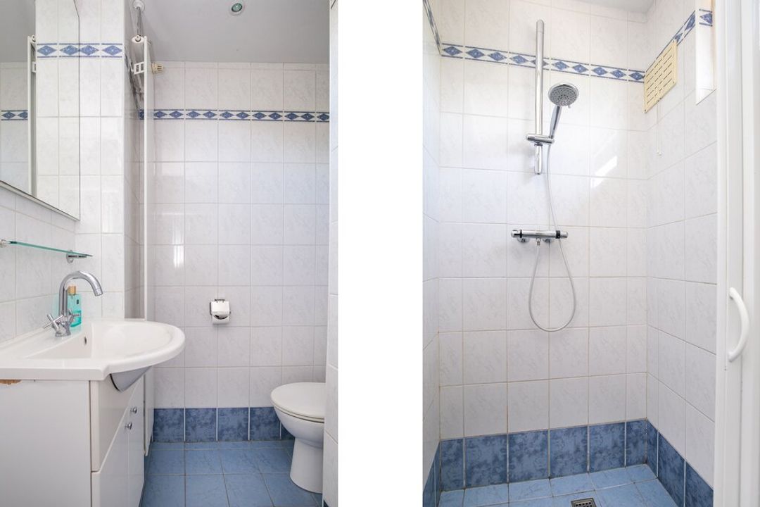 De toiletruimte is volledig betegeld met zowel wit- als blauw gemarmerde wandtegels. Op de vloer is er eveneens gekozen voor een blauwe vloertegel. De ruimte heeft naast een staand toilet, een fonteintje en mechanisch ventilatiesysteem.