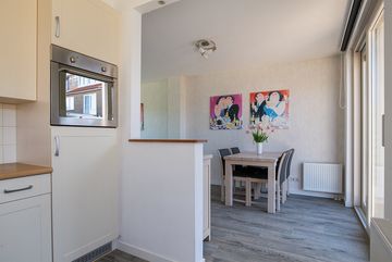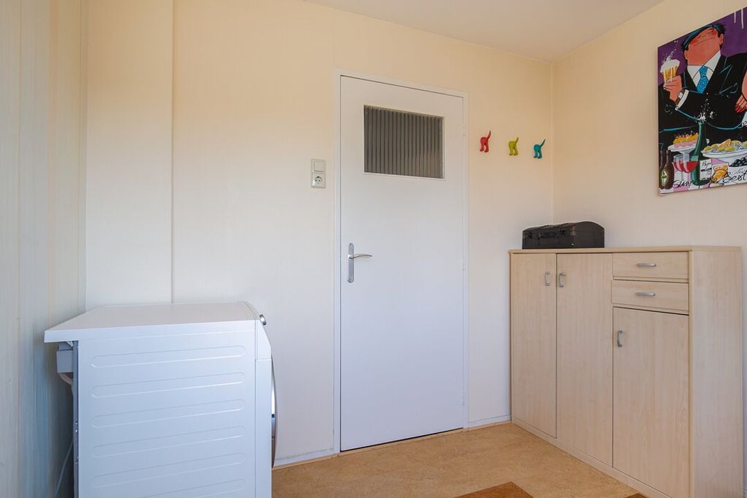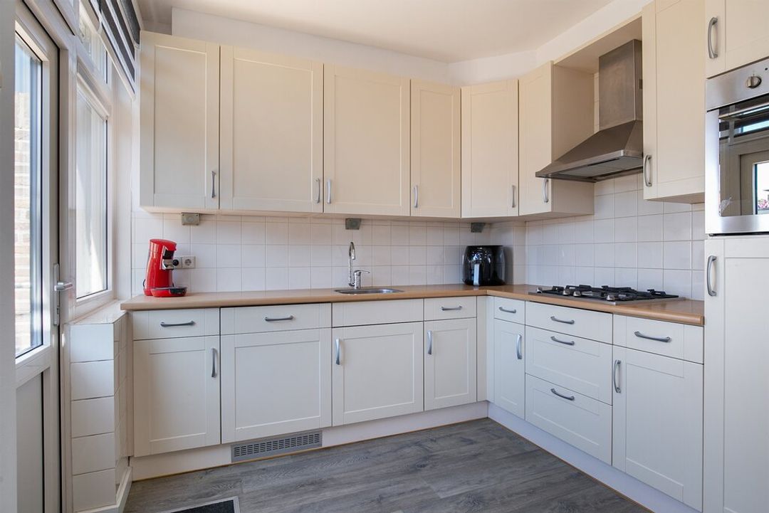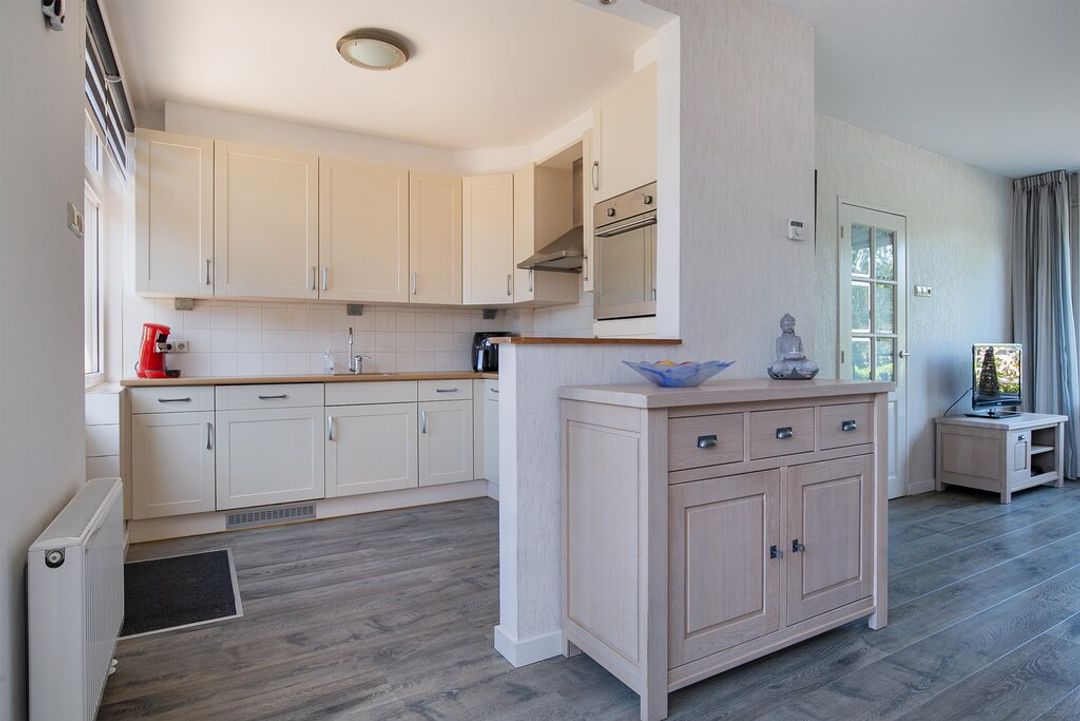 De keuken heeft met haar L- opstelling en vele opbergkasten ontzettend veel werk- en opbergruimte! De keuken is afgewerkt met crème kleurige panelen, een houtlook werkblad met RVS spoelbak en een wit betegelde achterwand. Boven het 4 pits gasfornuis hangt tussen de kasten in een RVS afzuigkap. Daarnaast is de keuken voorzien van diverse inbouwapparatuur zoals; een vaatwasser, koelkast met vriesvak en een oven.