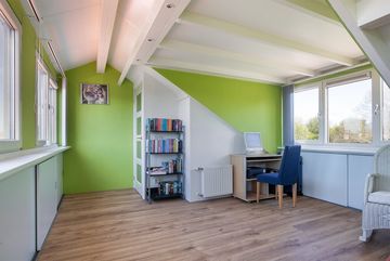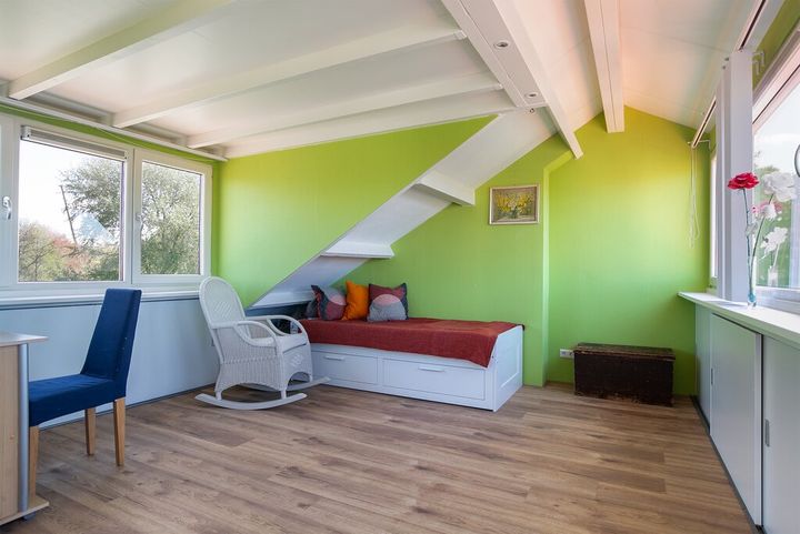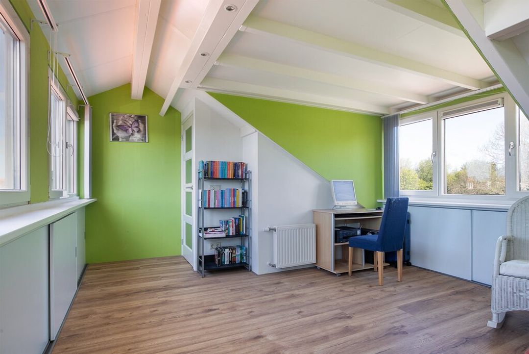 Middels de gestoffeerde trap betreedt u de overloop op de tweede verdieping. Op de overloop is de Nefit CV ketel (2007) handig weggewerkt in het nisje. Daarnaast heeft u vanuit hier toegang tot de royale 4e slaapkamer. Deze kamer heeft dakkapellen aan zowel de voor- als achterkant, met aan beide kanten extra bergruimte achter de knieschotten. De kamer is licht afgewerkt met groen schilderwerk aan de wanden en heeft een eikenhouten laminaatvloer.