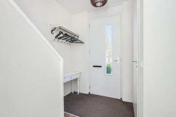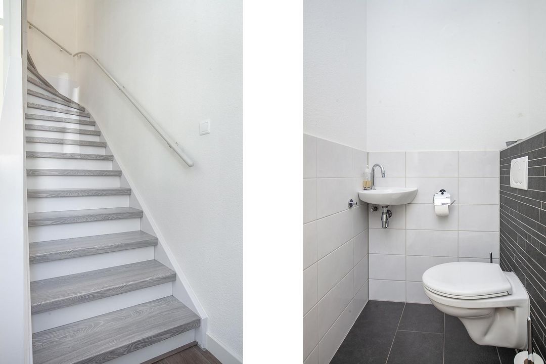 U betreedt de woning middels de hal met toegang tot de meterkast(8 groepen/garderobe, woonkamer met open keuken, toilet en de trap naar de verdieping. Het moderne toilet heeft een zwevend toilet, fonteintje en is half betegeling, dit met een combinatie van witte en antracietkleurige tegels.