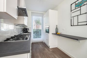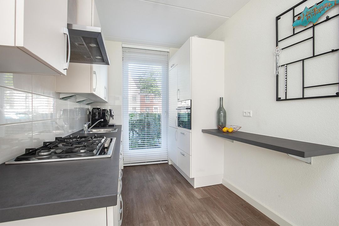 De open keuken is aan de voorzijde van de woning en is opgedeeld in een kookgedeelte (5-pits fornuis en rvs-afzuigkap en spoelgedeelte (rvs-spoelbak en vaatwasser), de andere zijde is voorzien van de koelvriescombinatie, combi-oven en keukenkastjes. De keuken heeft witte keukenkastjes en een antraciet aanrechtblad.