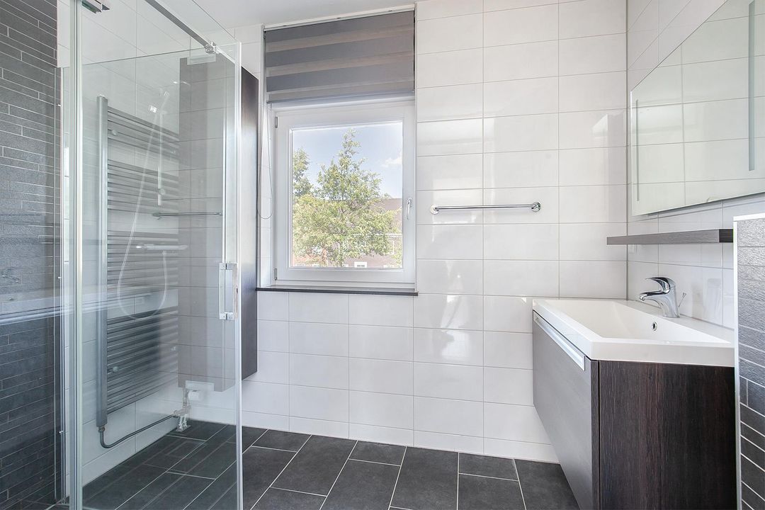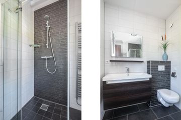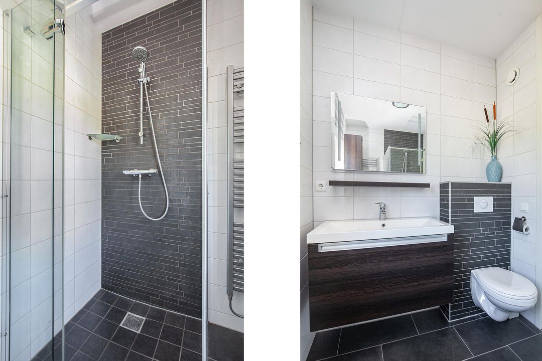 De moderne badkamer is volledig betegeld en heeft net als het toilet van de begane grond, een combinatie van een witte en een antraciet tegel. De inloopdouche, wit zwevend toilet, antraciet designradiator en het badkamermeubel met wastafel maken het tot een heel keurig geheel! Het mechanische ventilatiesysteem en het raam zorgen beide voor de nodige ventilatie.